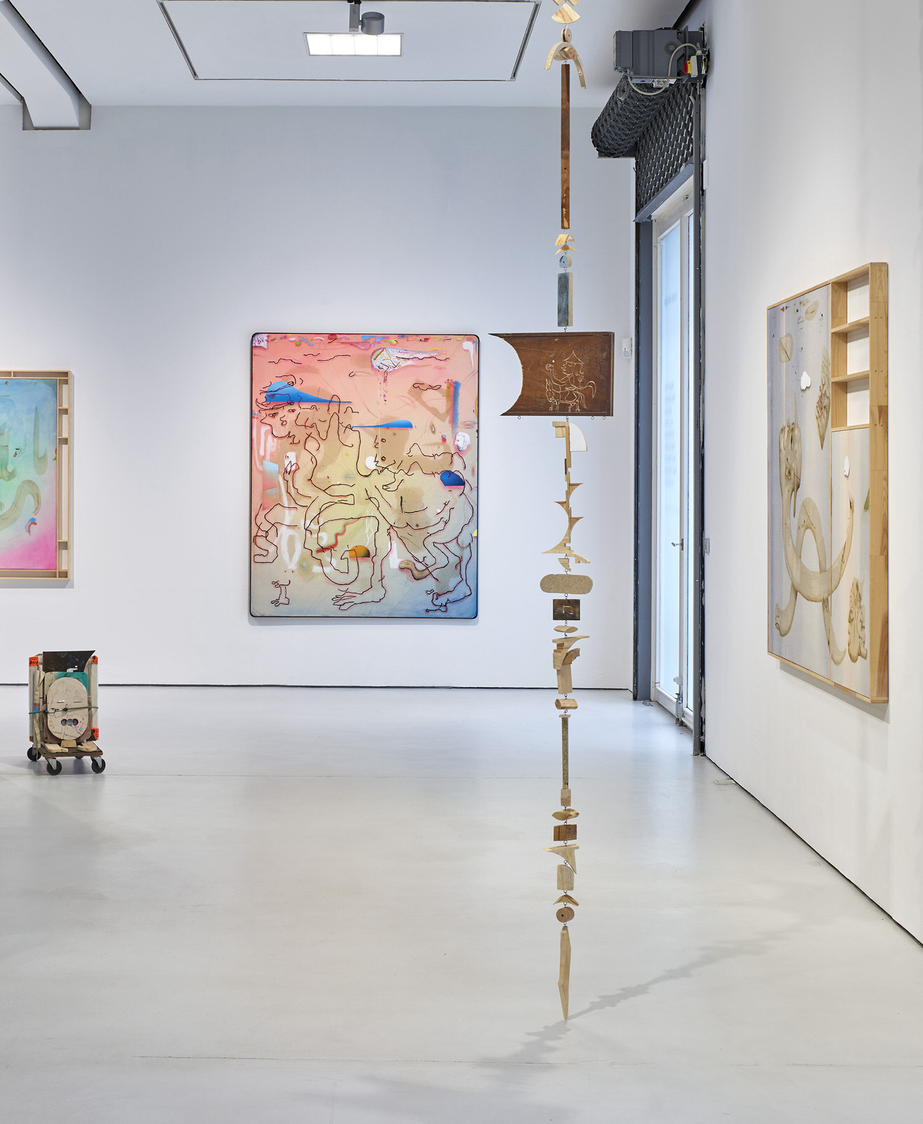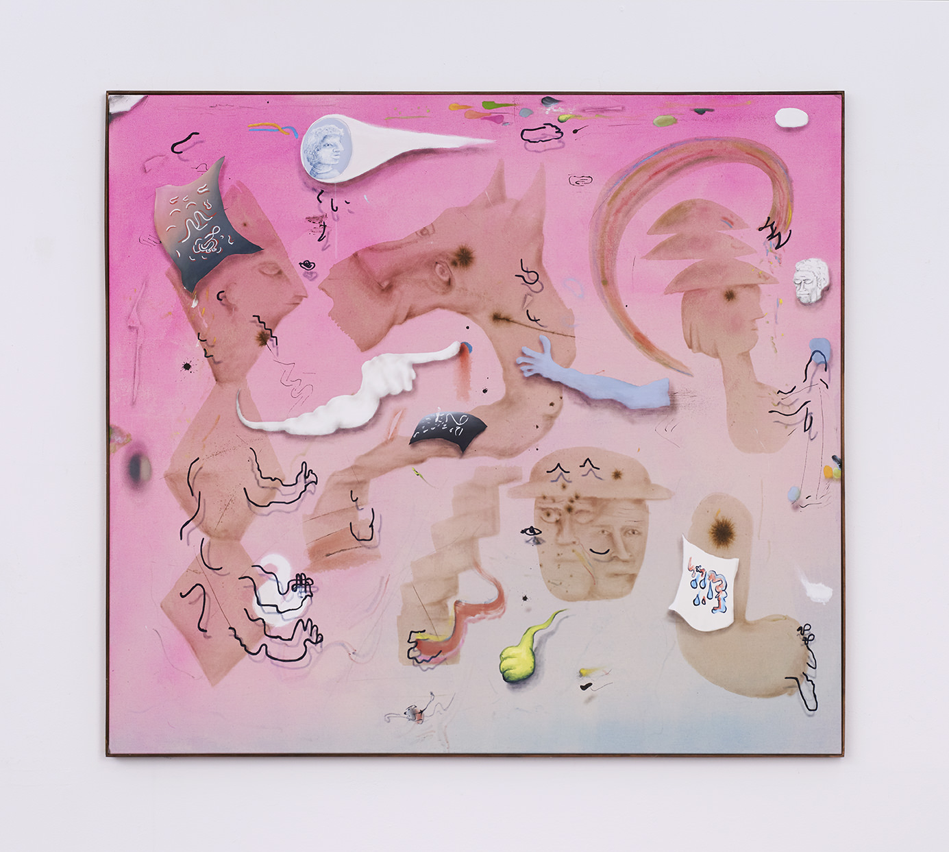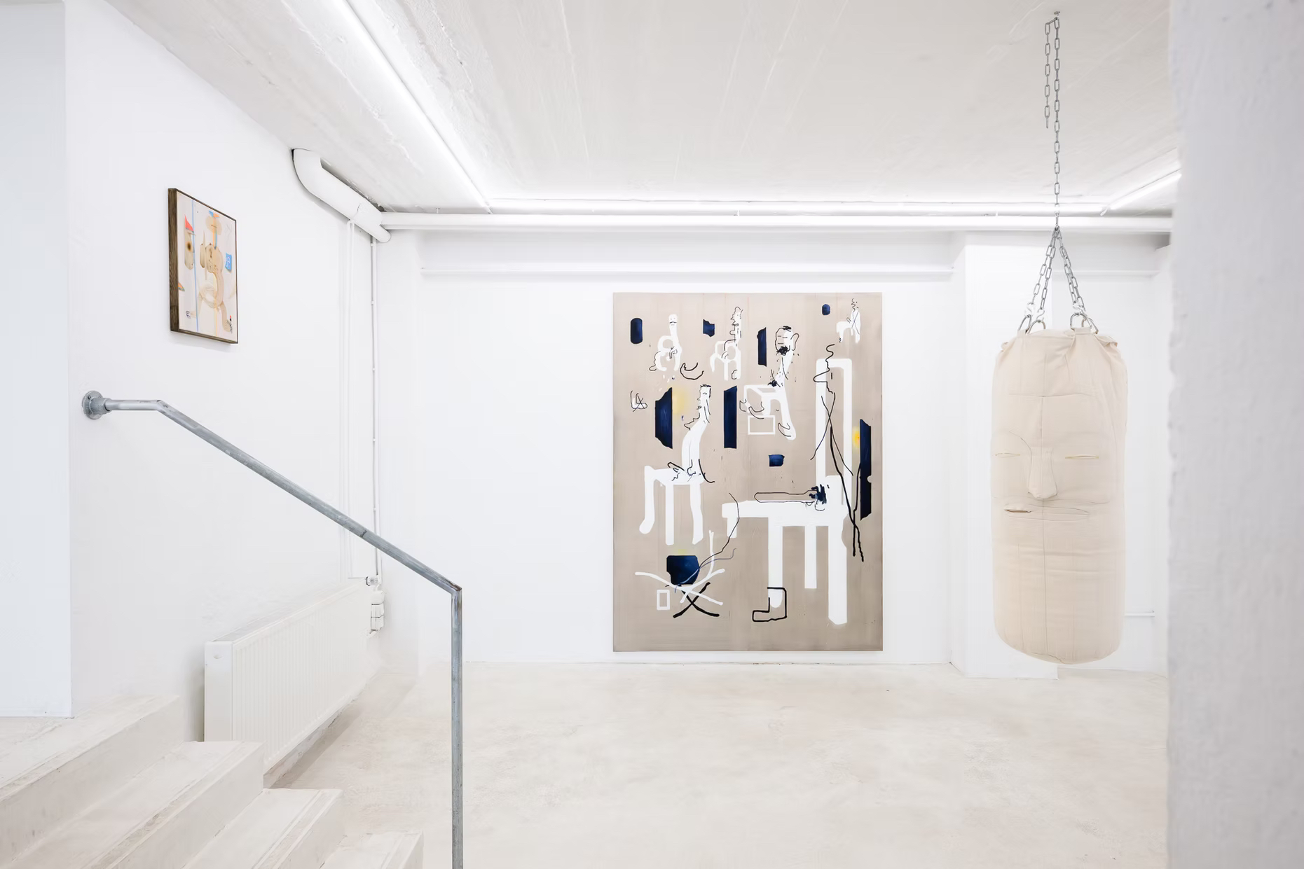 The alliance with Philip Guston, arguably the progenitor of this forthright type of “genuine” painting, is perhaps most apparent here in the work of Lorenzo Pompa. His figures are primary yet complex elements with a streamlined corporal appearance that nonetheless strongly conveys human emotions.