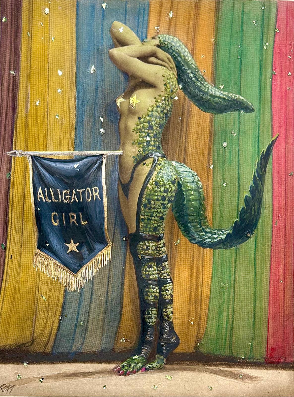 FOUNTAINS & ALLIGATORS is a bit of a departure from the collage work I’ve created in that the theme is extended over several dozen plates. Usually I work only on individual themes. Before these collages, I worked 17 years depicting hair from every possible perspective. The work may change but the rigor/obsessiveness does not. Drawing is the passion behind it all. I am most interested in “what” and “how” .
