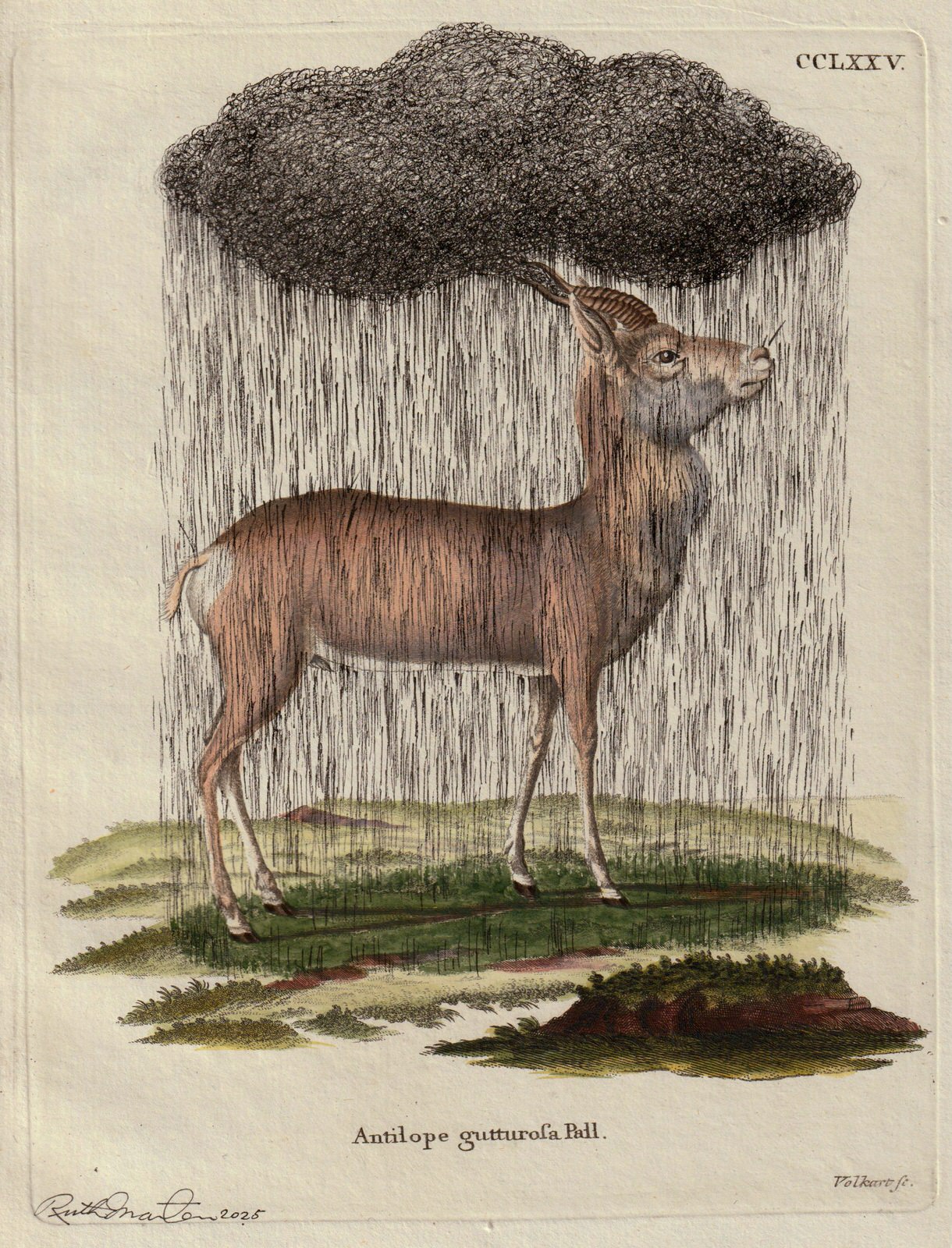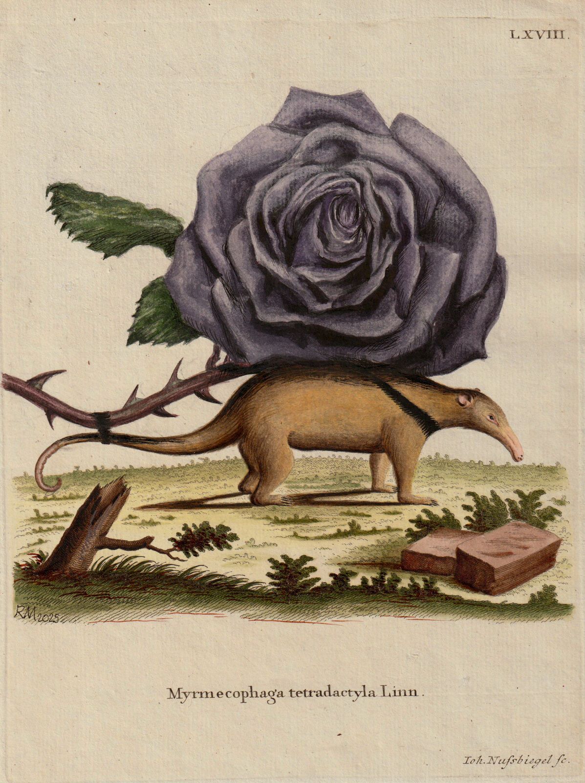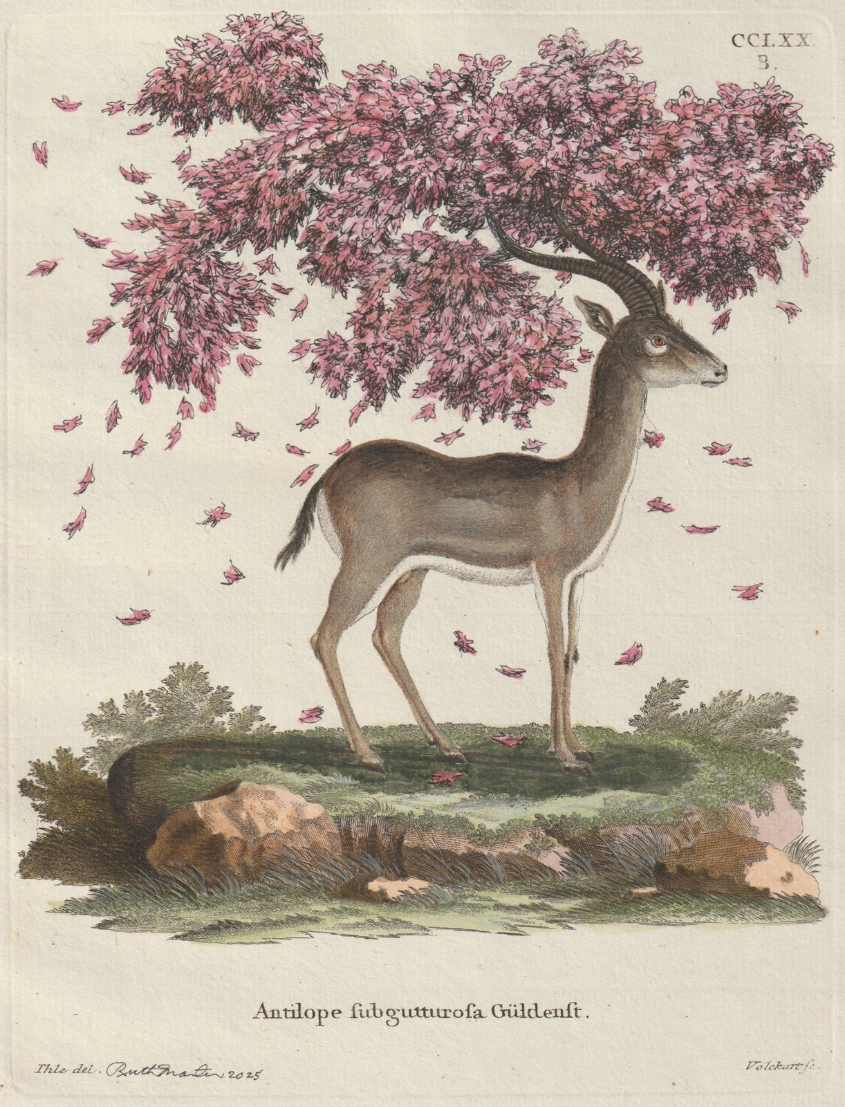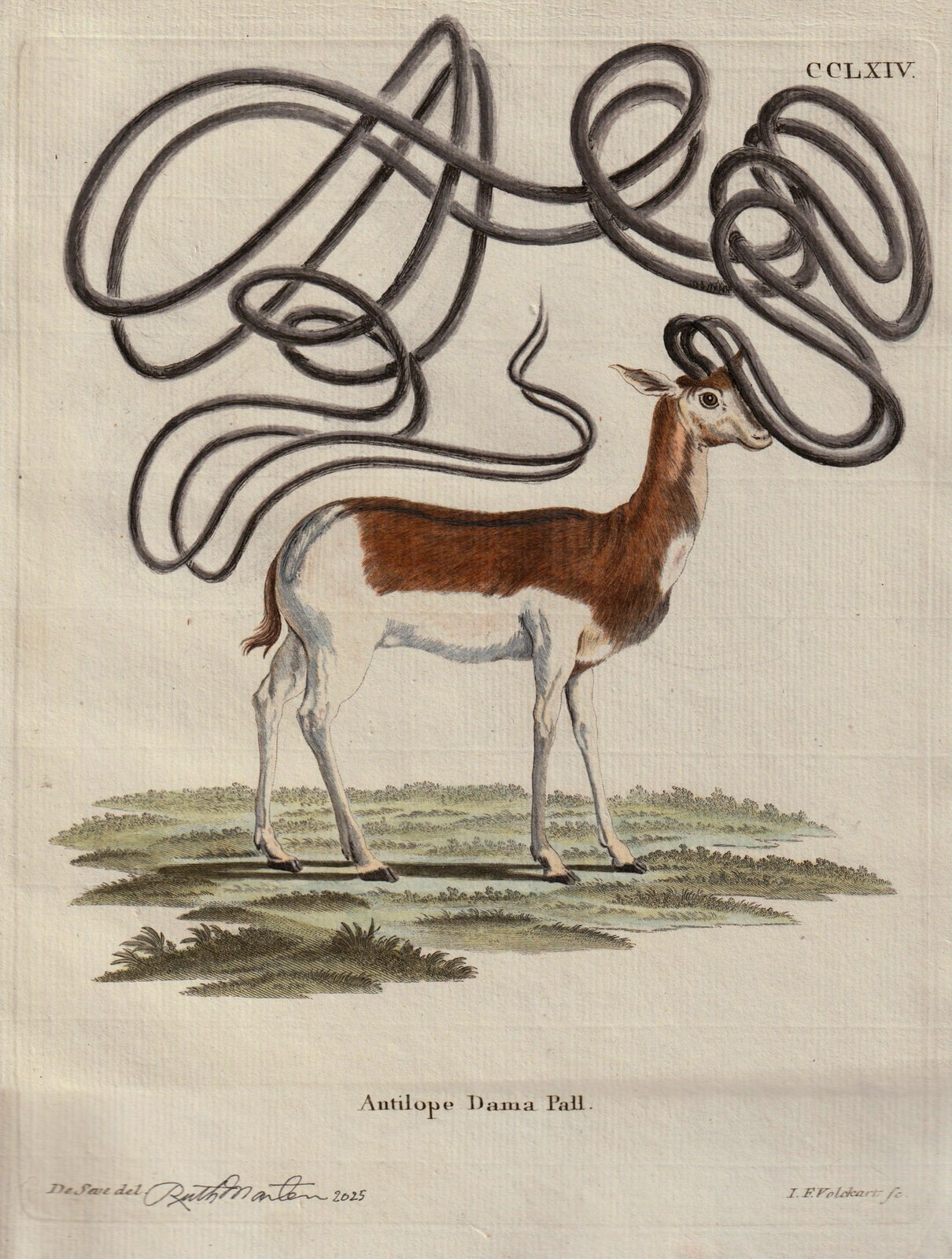 Ruth Marten’s cosmos of pictorial inventions is absolutely endless, for she helps herself to the rich treasury of western cultural history in the form of prints from the 18th and 19th century. These original graphics she mostly culls from encyclopedias in which the knowledge of the world is depicted, from zoological atlases or catalogues of furniture or home décor, where they populate the flea markets and antiquarian bookshops and where Ruth Marten forages them out. She takes them home to her studio and breathes new life into them. With the same meticulous strokes, she adds elements, collages and coloring, infusing them with a visible subconsciousness, one that is subversive, poetic, sexually charged, playful and/or pernicious. Ruth Marten’s works on paper are unique in their dexterity and hold their own in the same tradition with Max Ernst and Jan Svankmajer.