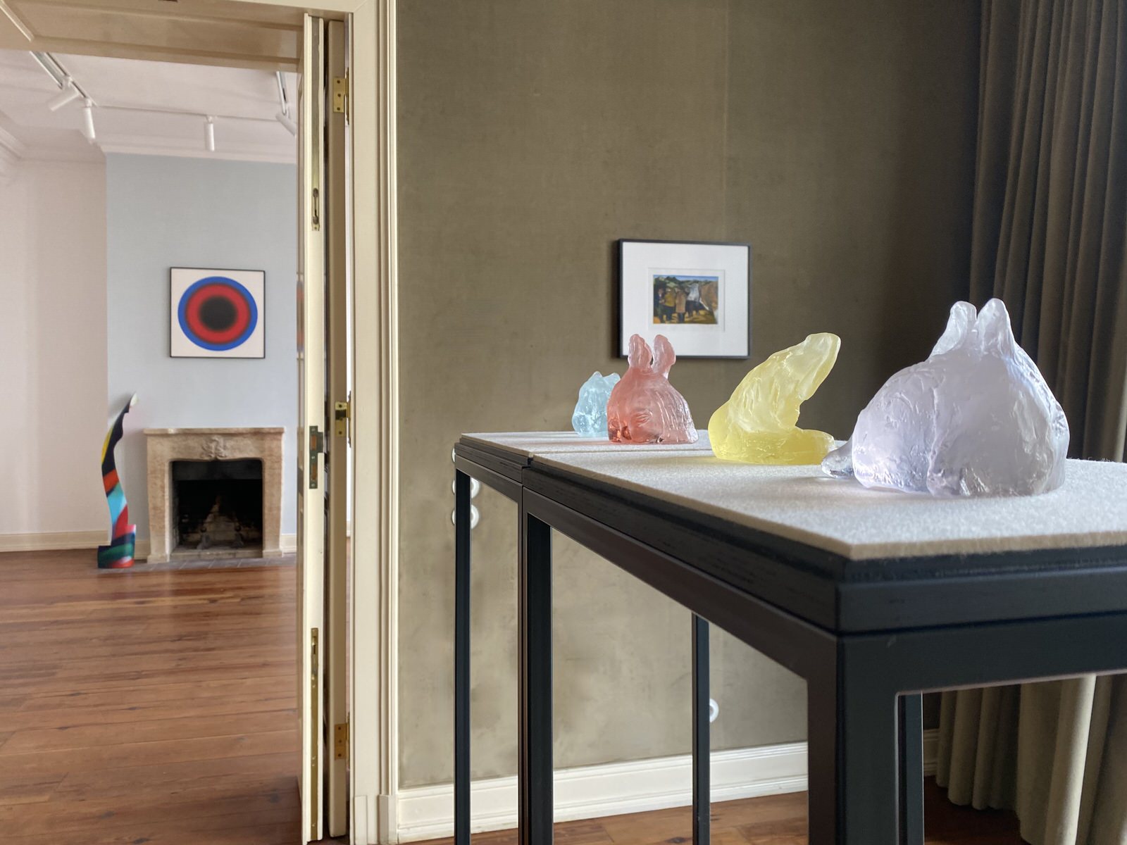 The work of LEIKO IKEMURA (*1951) revolves around the delicate and often magical connection between humans, animals, and nature. Shimmering landscapes are populated by hybrid figures – part girl, part rabbit – that inhabit an intermediate world where the boundaries between identity and reality become blurred. Her paintings and sculptures blend echoes of Japanese spirituality with Western artistic tradition, evoking femininity, vulnerability, and a sense of cosmic interconnectedness through fragile, almost ghostly images. Her series „Awakening“ includes four glass sculptures which also unfold a dreamlike and poetic imagery. In delicate shades of yellow, pink, violet and blue, they oscillate between figuration and abstraction, tying in with the artist’s central motif: the chimera — a mythical hybrid creature combining human and animal features. Their shiny surfaces of the sculptures subtly refract light, making them appear to glow from within.