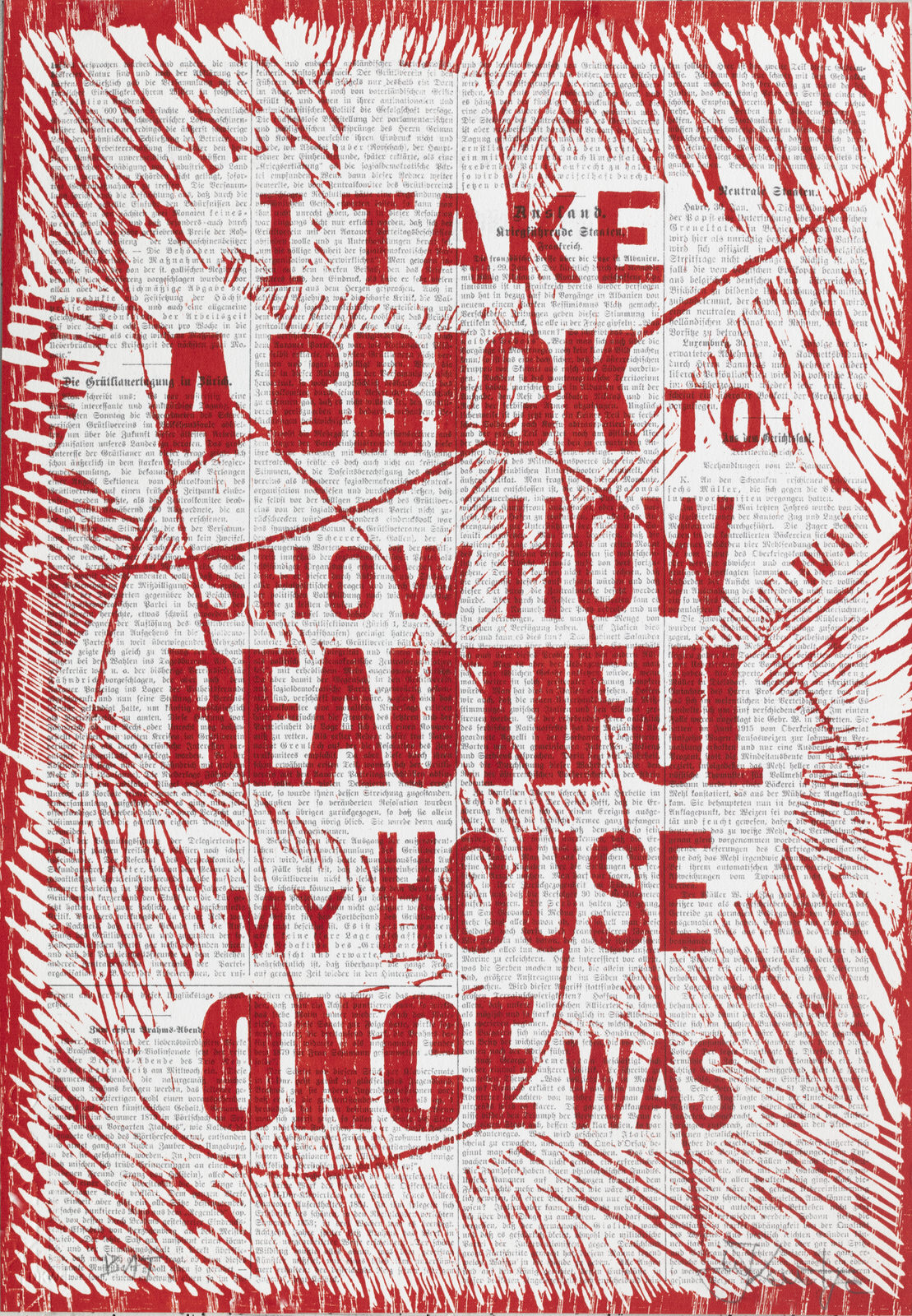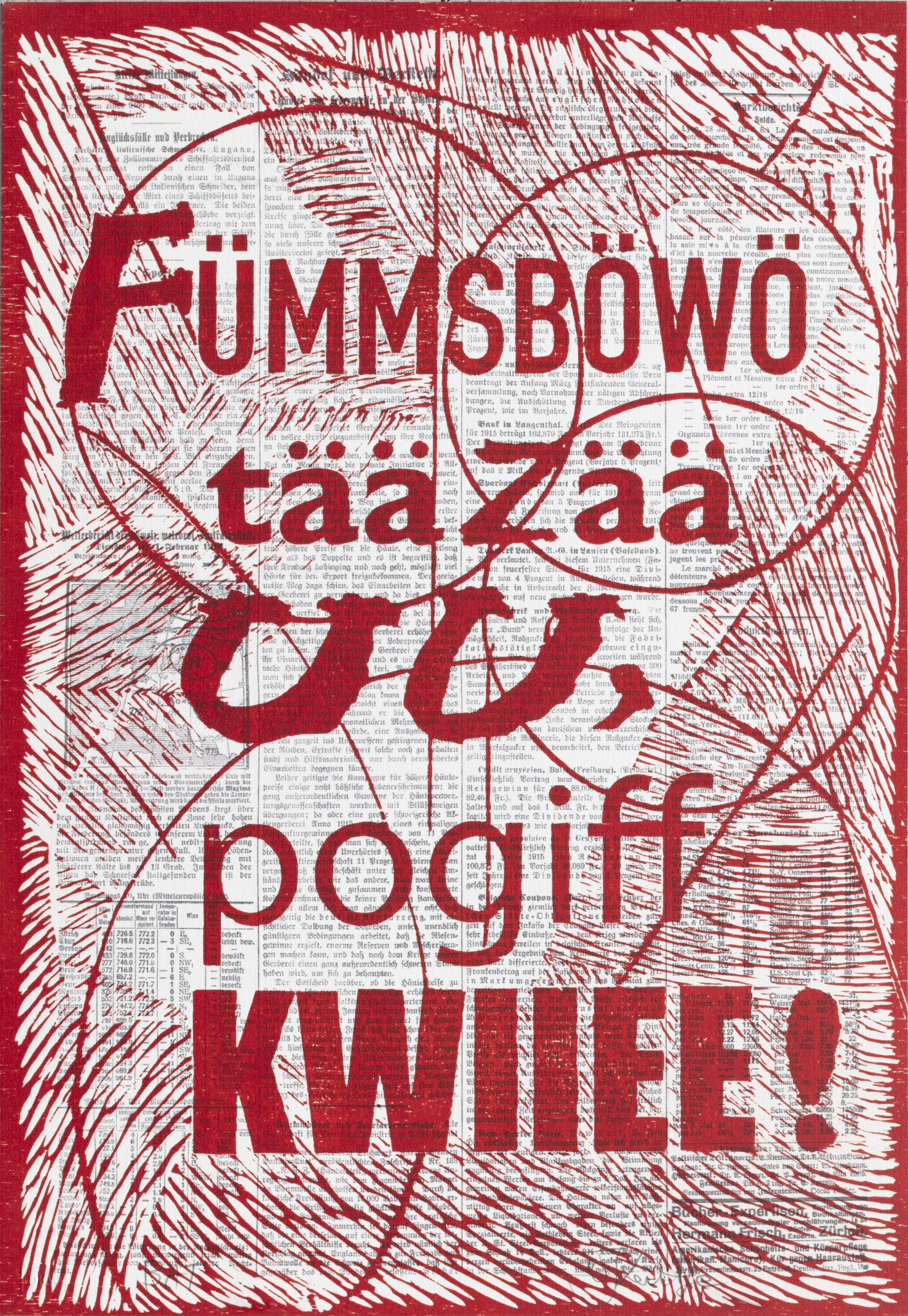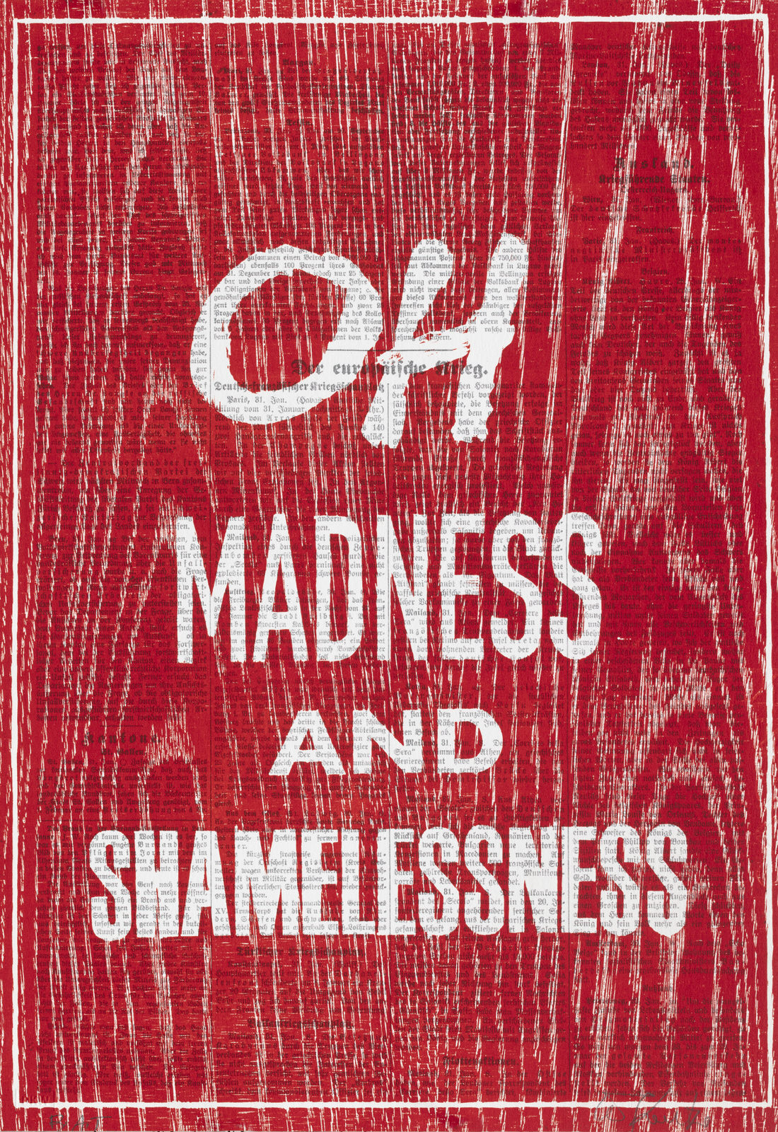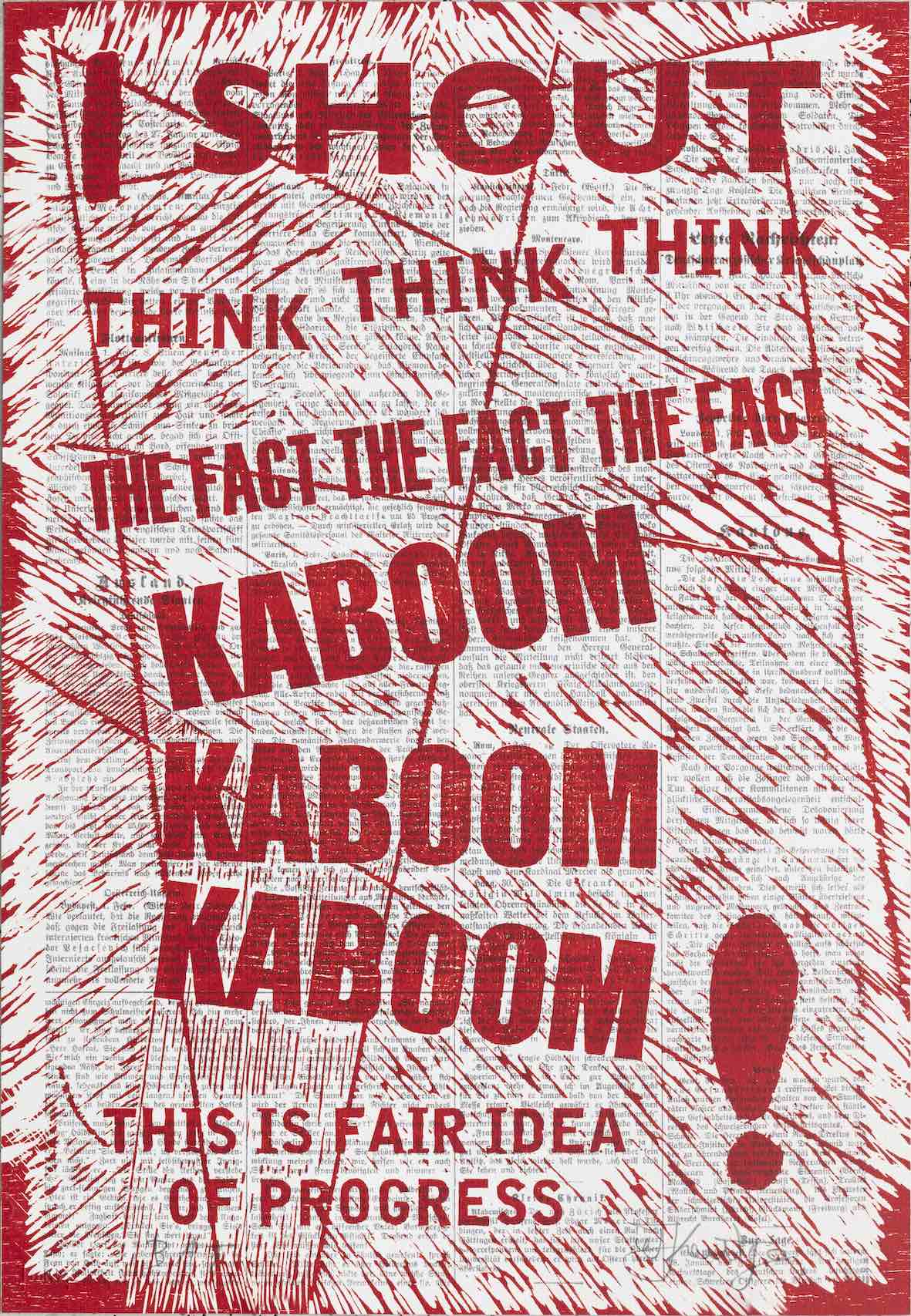 The Headlines edition comprises six woodcuts reminiscent of newspaper headlines, their ambiguity echoing the Dadaist tradition. Texts from Tristan Tzara’s manifesto, Kurt Schwitters’ Ursonate and a poem by Bertolt Brecht are combined with a reference to Kentridge’s own art centre, The Centre for the Less Good Idea in Johannesburg. The prints were created in collaboration with Sbongiseni Khulu at the David Krut Workshop in Johannesburg. They are based on reproductions from the Neue Zürcher Zeitung of 1 February 1916 from the Swiss National Library – the day the Cabaret Voltaire opened in Zurich, creating a direct link to the nucleus of the Dada movement. The printing blocks were made of ash and oak, all save one cut entirely by hand, and printed with a red ink mixture.