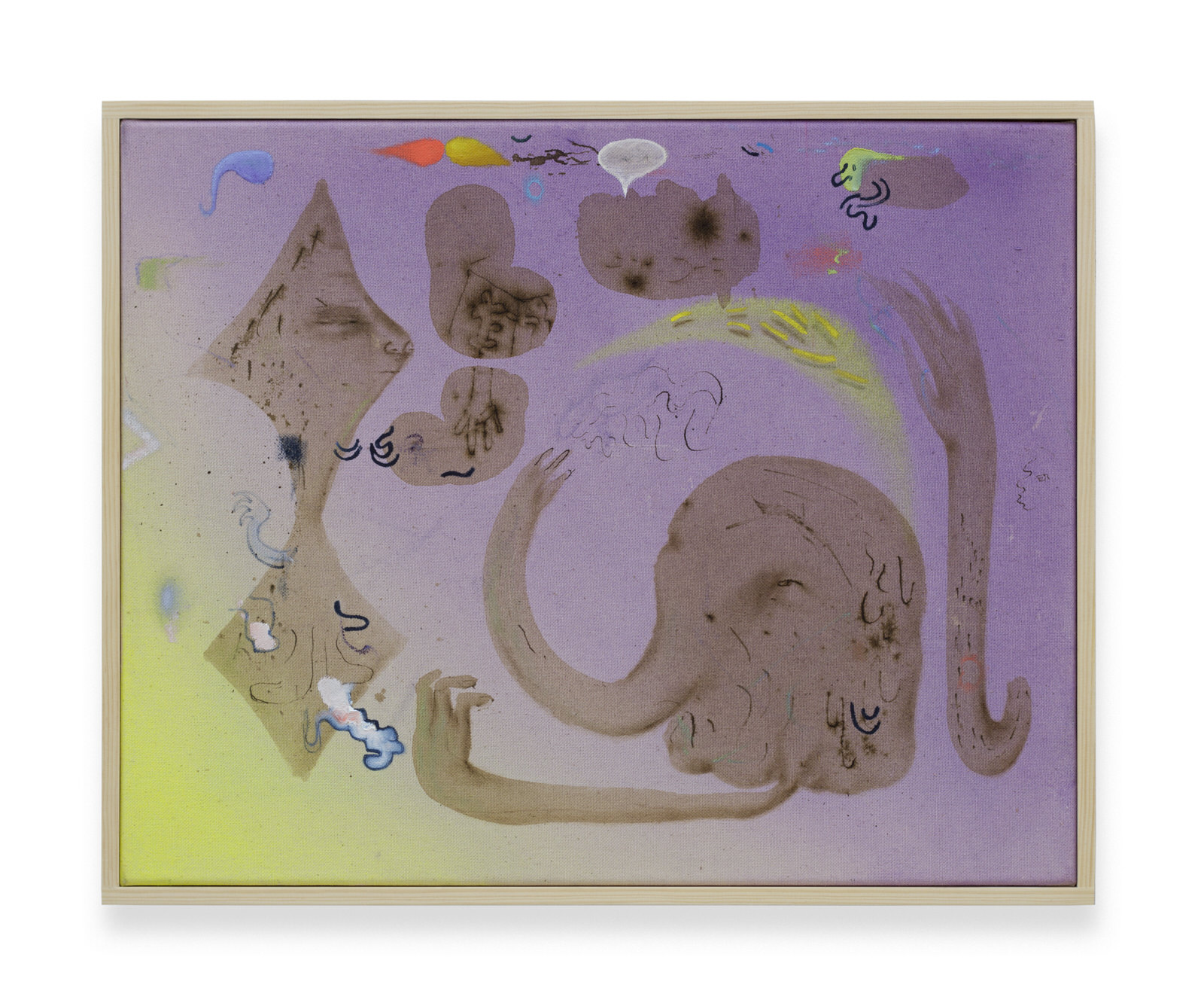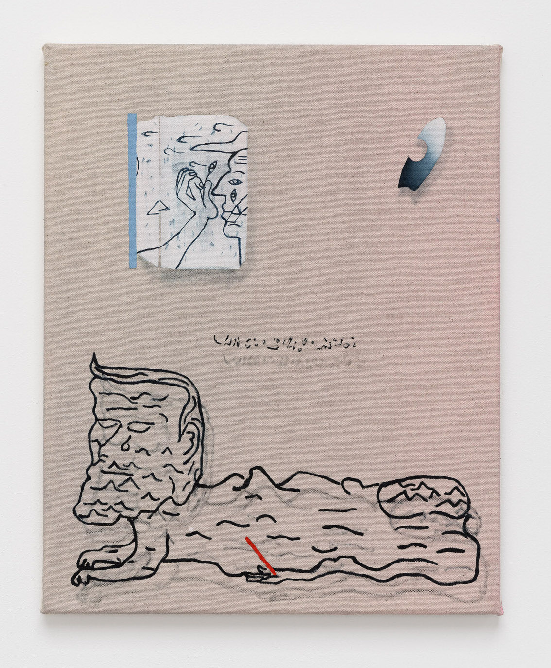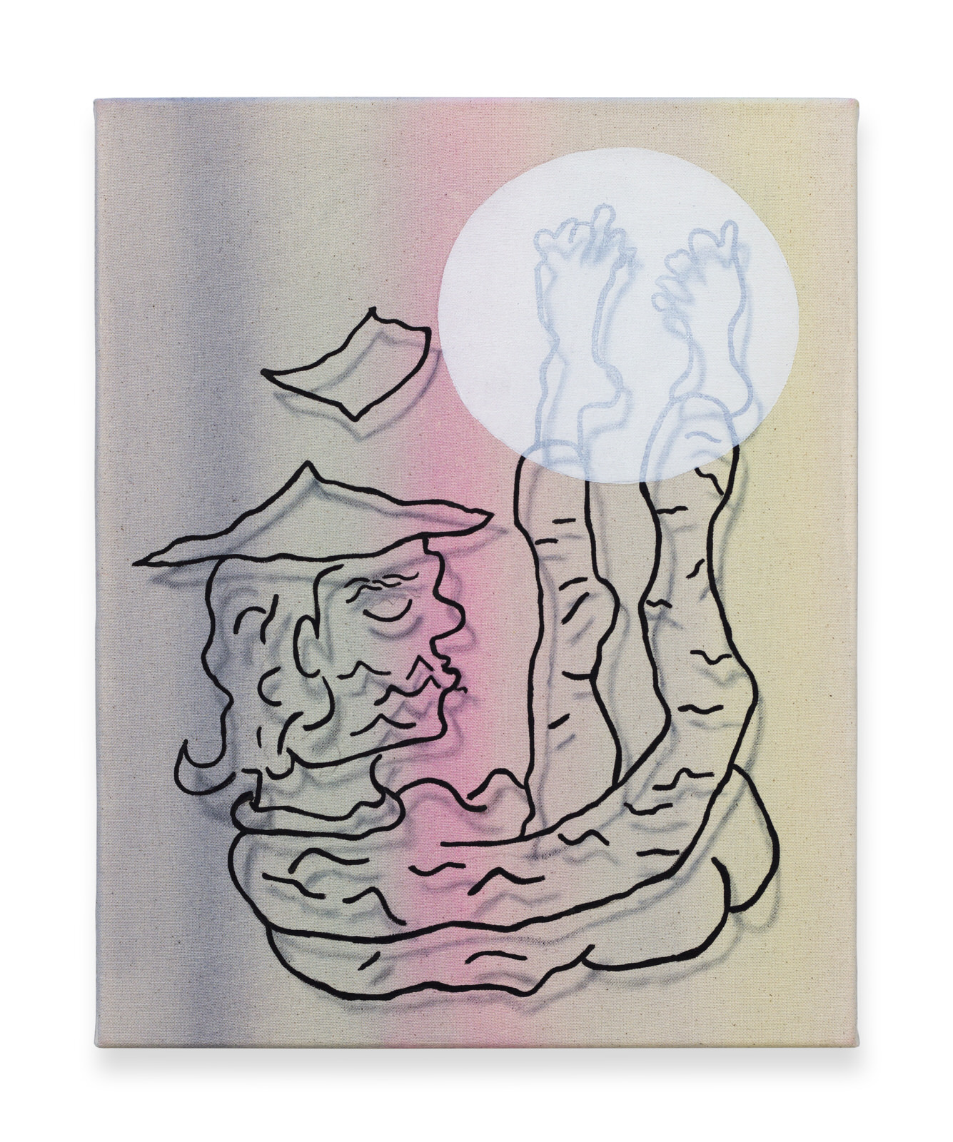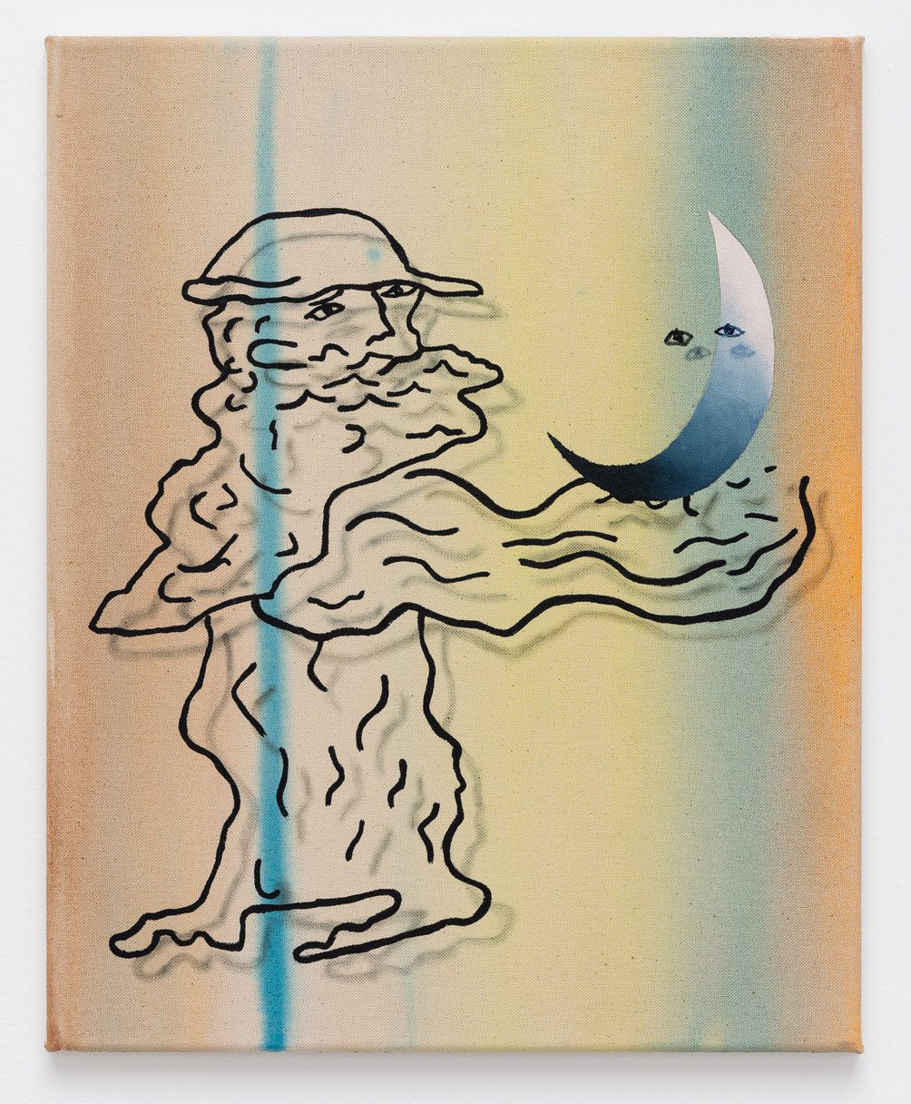 Some of the paintings in the show appear to be somewhat less complex and thus easier to “read”: they comprise, as a rule, a single main element, a figure drawn in thick black lines against a pastel background, often accompanied by two or three clearly defined elements in color (Hold on, 2025). The uneven, almost tremulous line of the drawing could just as well be the product of a finger on a touch screen, while the manner in which the figures are stylized lend them a powerful presence. The shadows that the black line casts on the canvas also create the illusion of three-dimensionality, so that the shapes appear to float.