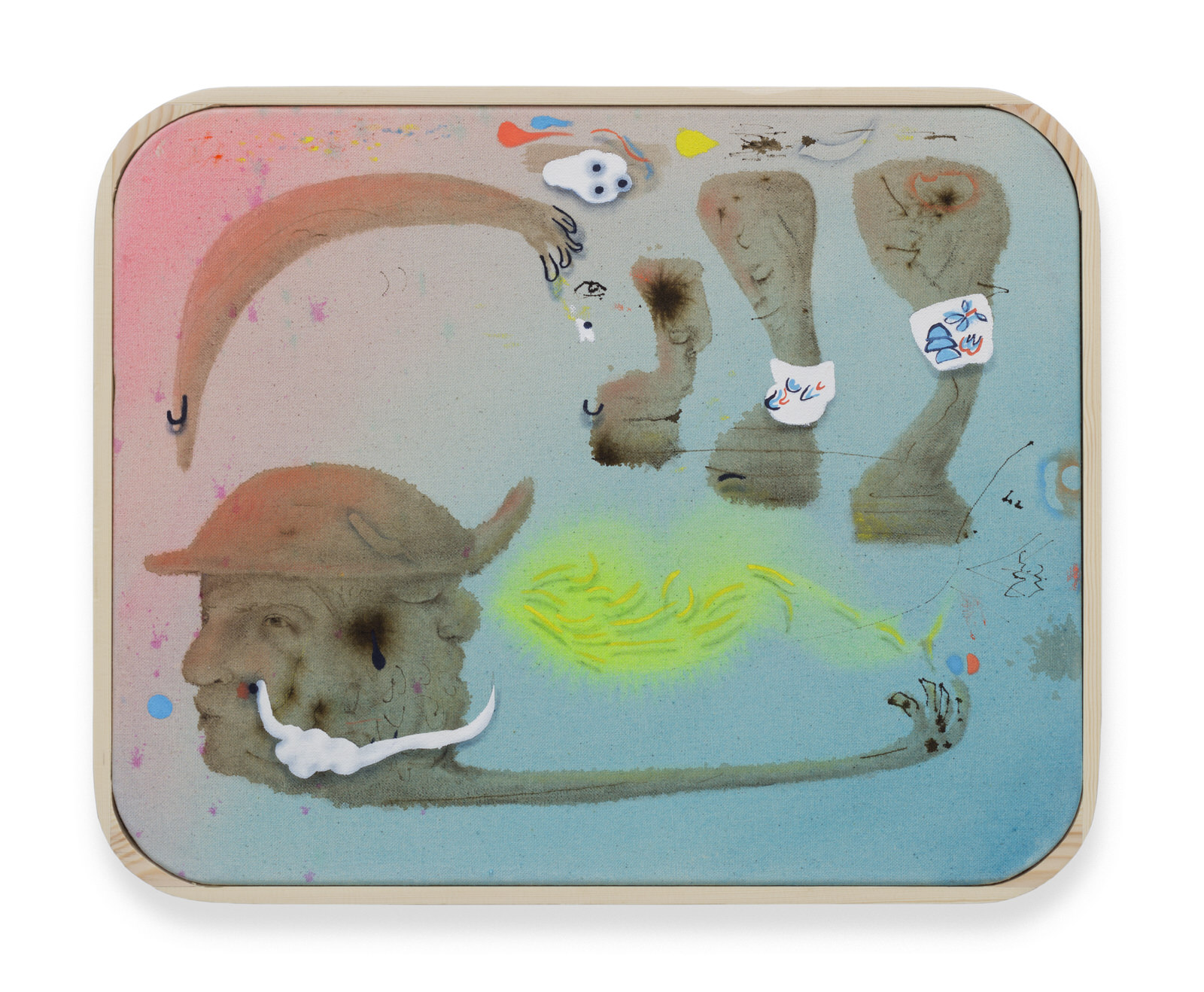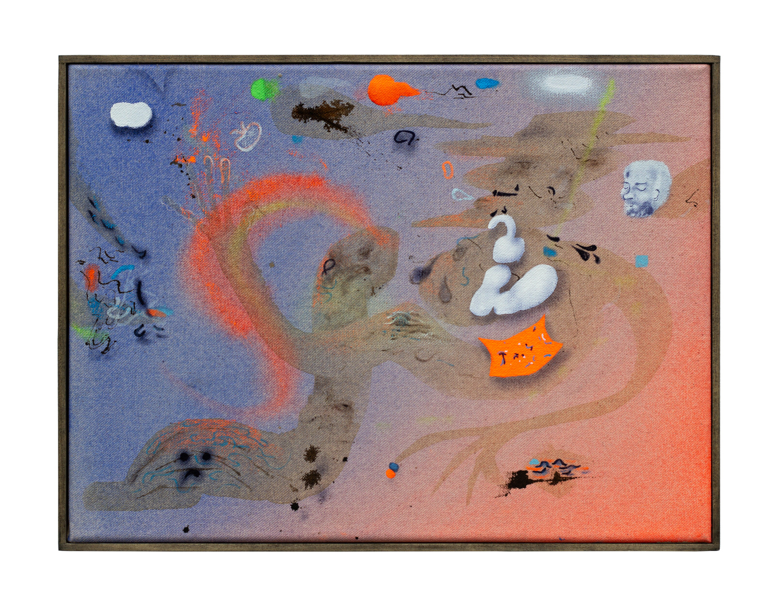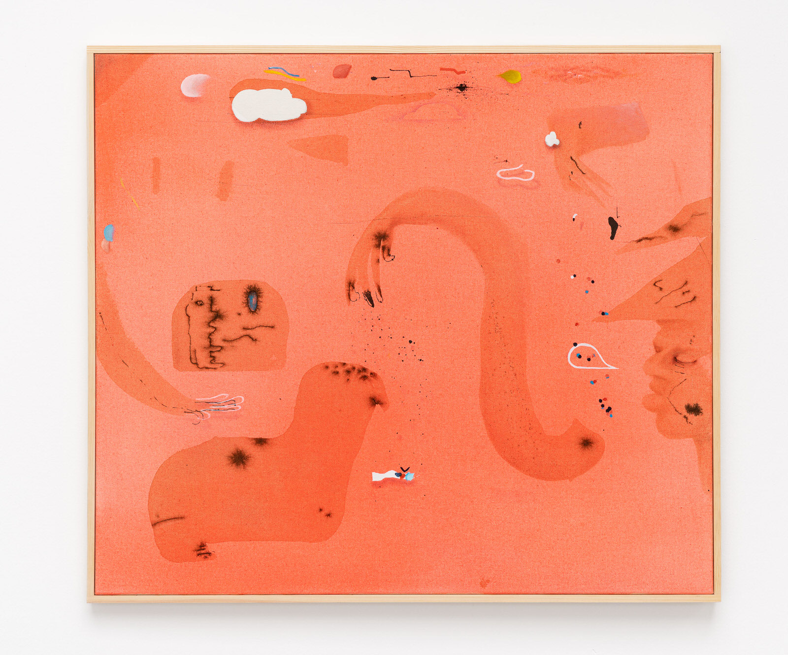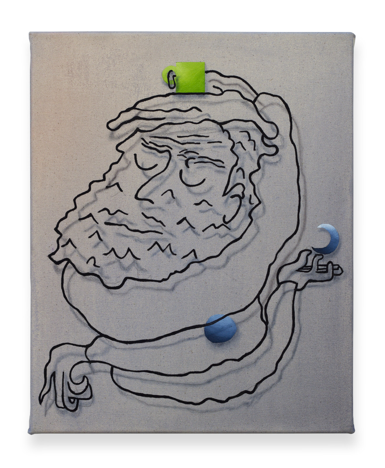 Some of the paintings in the show appear to be somewhat less complex and thus easier to “read”: they comprise, as a rule, a single main element, a figure drawn in thick black lines against a pastel background, often accompanied by two or three clearly defined elements in color (Hold on, 2025). The uneven, almost tremulous line of the drawing could just as well be the product of a finger on a touch screen, while the manner in which the figures are stylized lend them a powerful presence. The shadows that the black line casts on the canvas also create the illusion of three-dimensionality, so that the shapes appear to float.