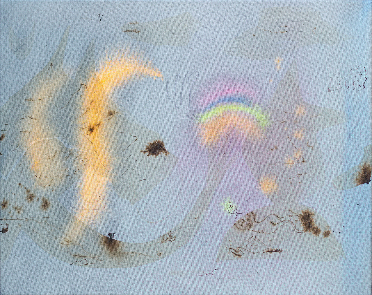 Similar to the cryptic works of Wassily Kandinsky, Joan Miró and Marc Chagall, Mordechay’s compositions prompt a variety of interpretations and analyses. Characteristics of both drawing and painting meet on the canvas, with its raw, textile-like structure against a background of color gradients in soft aquarelle tones, reminiscent of a luminous computer/TV screen. The painted elements are sometimes transparent, sometimes opaque, some figurative, other abstract; they are in some cases fragments, clearly separate from each other, while at times they partially merge into each other.