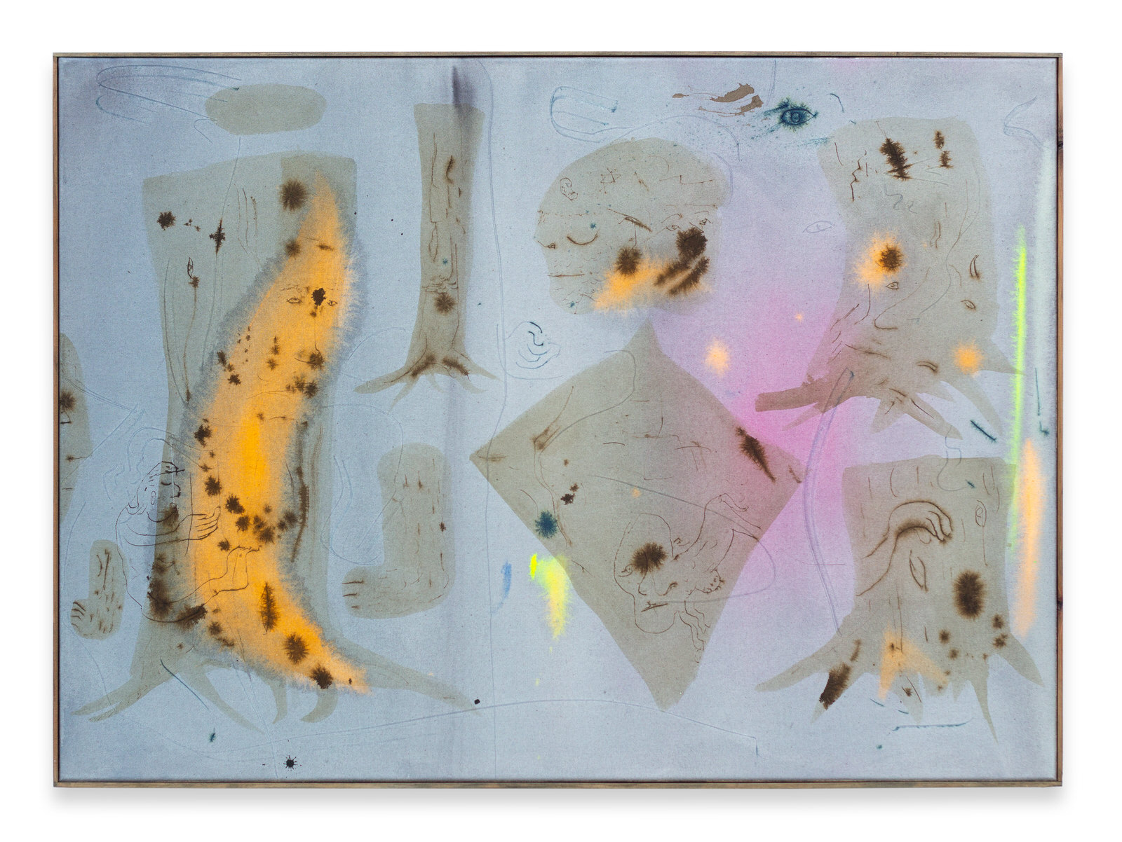 Unfettered by dictates of uniformity or rules of perspective, the shapes, figures, signs and symbols float like a complex alphabet across the entire surface on various levels of the pictorial space. The motifs in strong, saturated colors (like the little white clouds or the neon orange in An Archive Dream, 2024), seem very close up, almost relief-like, as if they were protruding from the canvas. Others appear shadow-like; transparent silhouettes that recede into the background and meld with it. Splotches of brown ink bleed out within the shapes, becoming stars, forming an eye or lending the fleeting figures greater vivacity (as in Hide and Seek, 2025). Here and there, above the painted silhouettes or in the empty spaces between, we find scribblings of black or brown lines. Some of them are figurative drawings of easily recognizable motifs – a face, a body, figures that appear like fine-lined tattoos on some of the brownish, skin-like surfaces (as in The Secret, 2025); others are reminiscent of graffiti, of notation lines, abstract drawings or – as Mordechay puts it – “the body as a sketchbook”.